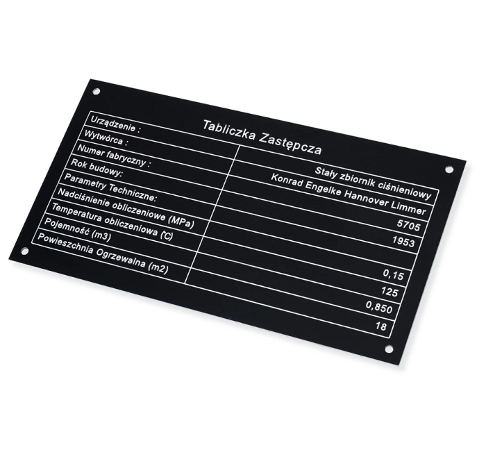 • Metal: Stal nierdzewna, aluminium i mosiądz są najczęściej wybieranymi metalami. Są trwałe, odporne na korozję i wysokie temperatury, co sprawia, że doskonale nadają się na tabliczki do urządzeń działających w trudnych warunkach. Metalowe tabliczki mogą być grawerowane lub tłoczone dla dodatkowej trwałości napisów.